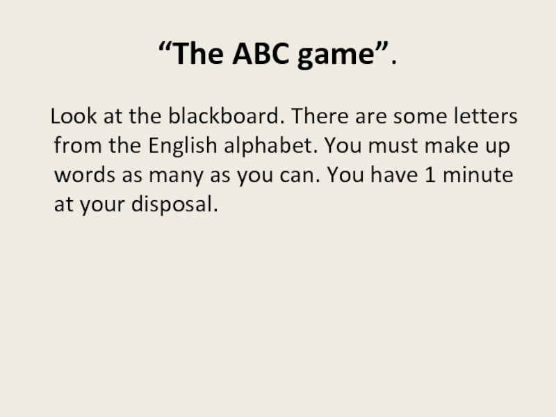“The ABC game”. Look at the blackboard. There are some letters from the English alphabet. You must make up words as many as you can. You have 1 minute at your disposal.