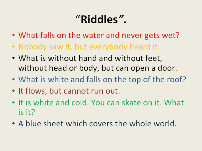 “Riddles”. What falls on the water and never gets wet? Nobody saw it, but everybody heard it. What