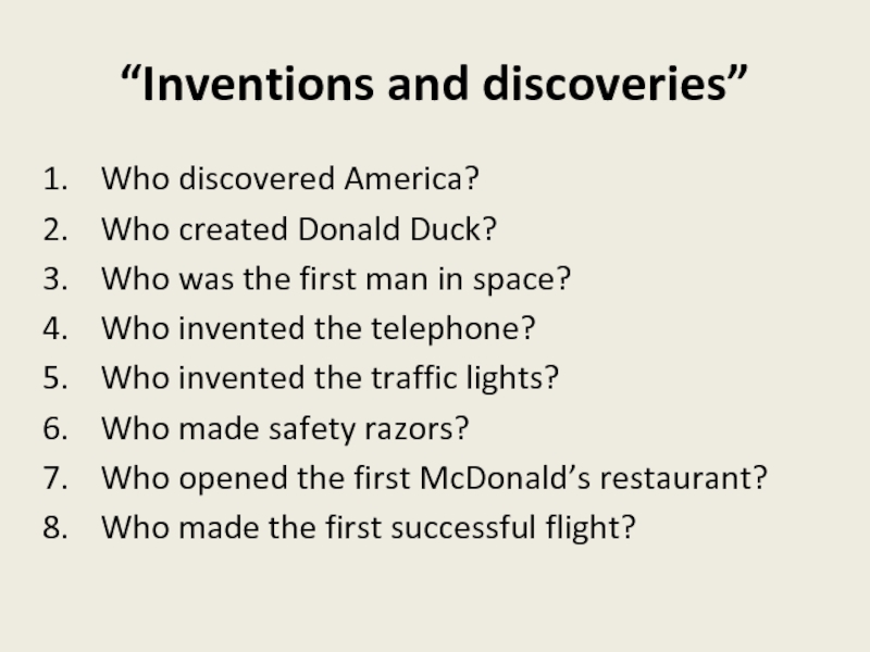 “Inventions and discoveries”Who discovered America? Who created Donald Duck? Who was the first man in space? Who