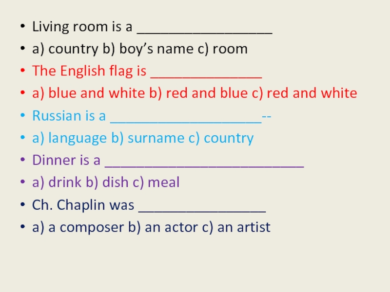 Living room is a _________________a) country b) boy’s name c) roomThe English flag is ______________a) blue and