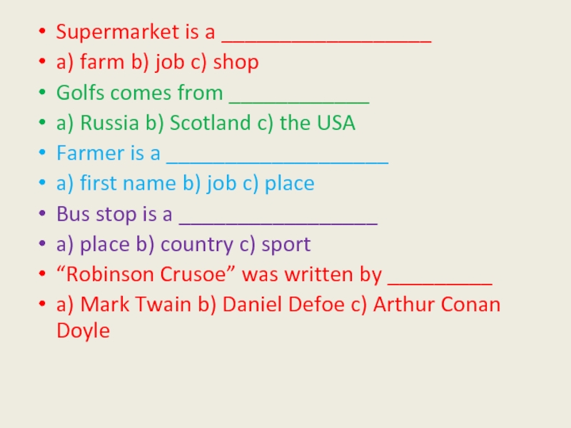 Supermarket is a __________________a) farm b) job c) shopGolfs comes from ____________a) Russia b) Scotland c) the