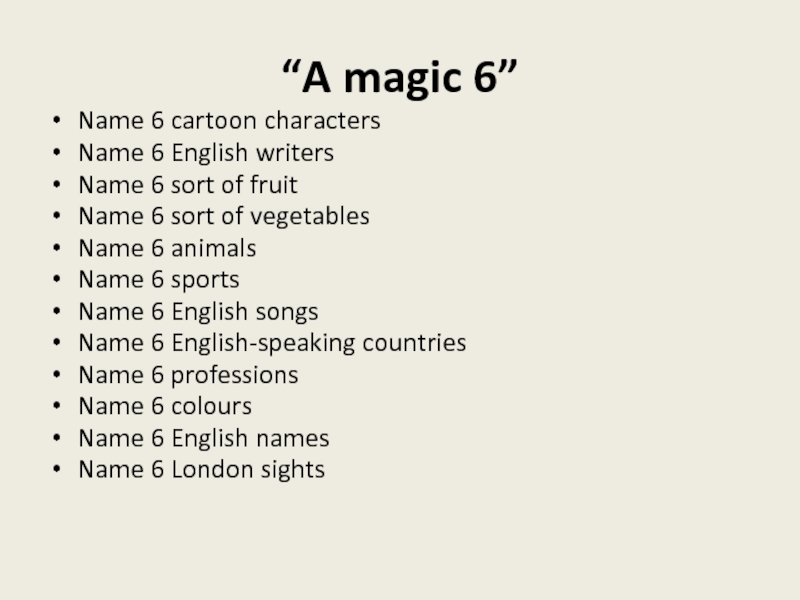 “A magic 6”Name 6 cartoon charactersName 6 English writersName 6 sort of fruitName 6 sort of vegetablesName