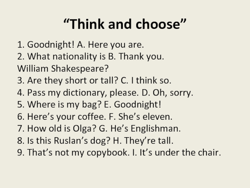 “Think and choose”1. Goodnight! A. Here you are.2. What nationality is B. Thank you.William Shakespeare?3. Are they short or