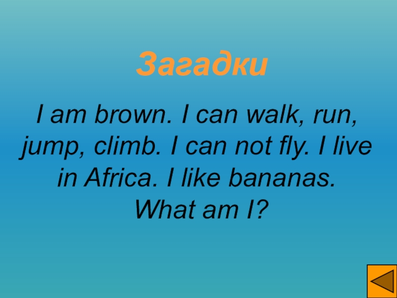 Загадки I am brown. I can walk, run, jump, climb. I can not fly.