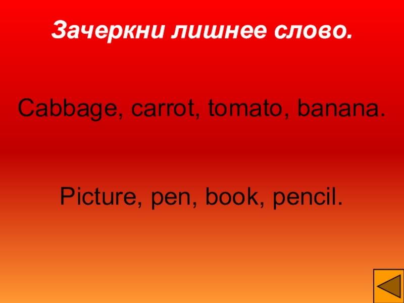 Зачеркни лишнее слово. Cabbage, carrot, tomato, banana. Picture, pen, book, pencil.