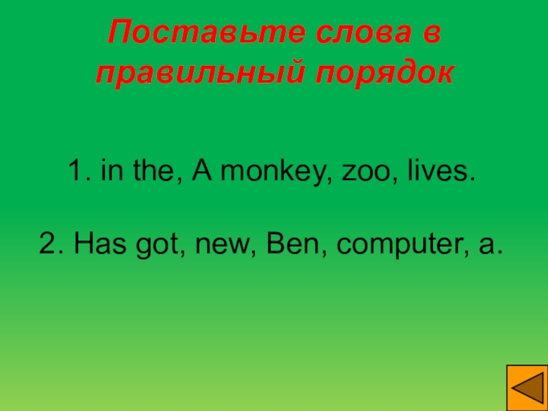 Поставьте слова в правильный порядок 1. in the, А monkey, zoo, lives. 2. Has got, new, Ben,