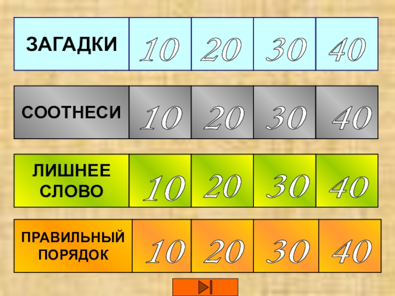 ЗАГАДКИЛИШНЕЕ СЛОВОСООТНЕСИПРАВИЛЬНЫЙ ПОРЯДОК10 20 30 40 10 10 10 20 20 20 30 30 30 40 40 40