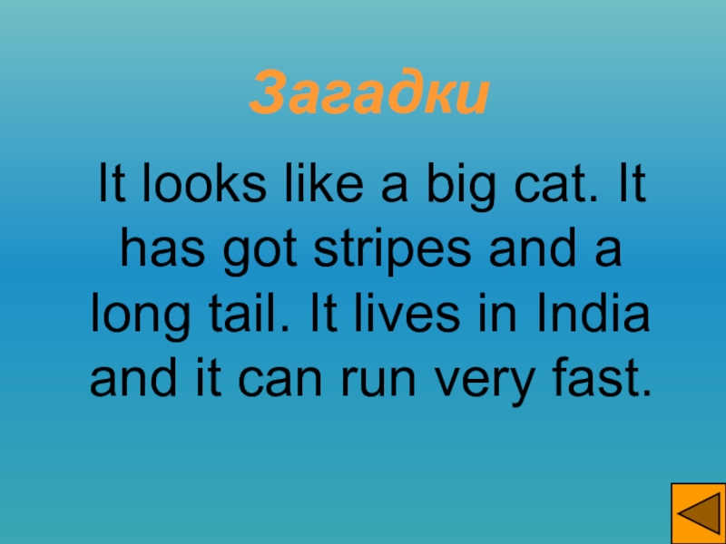 Загадки It looks like a big cat. It has got stripes and a long tail.