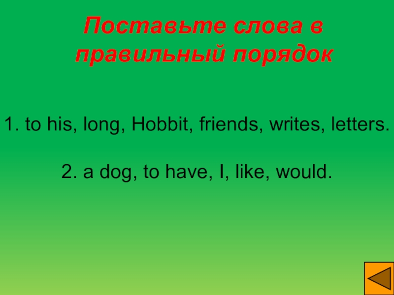 Поставьте слова в правильный порядок1. to his, long, Hobbit, friends, writes, letters.2. a dog, to have,
