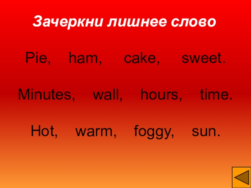 Зачеркни лишнее словоPie,  ham,   cake,   sweet. Minutes,  wall,  hours,