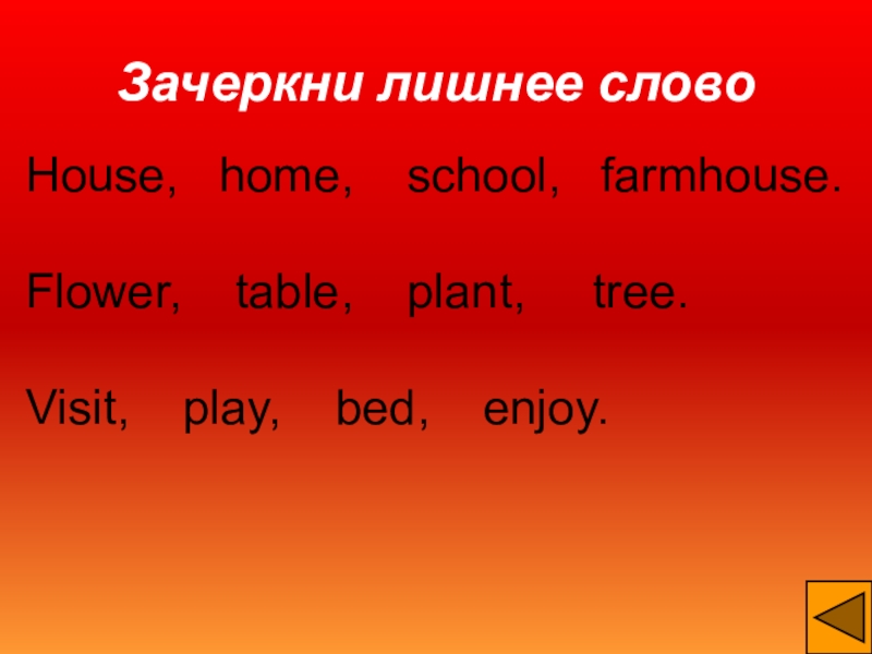 Зачеркни лишнее словоHouse,  home,  school,  farmhouse. Flower,  table,  plant,   tree.Visit,