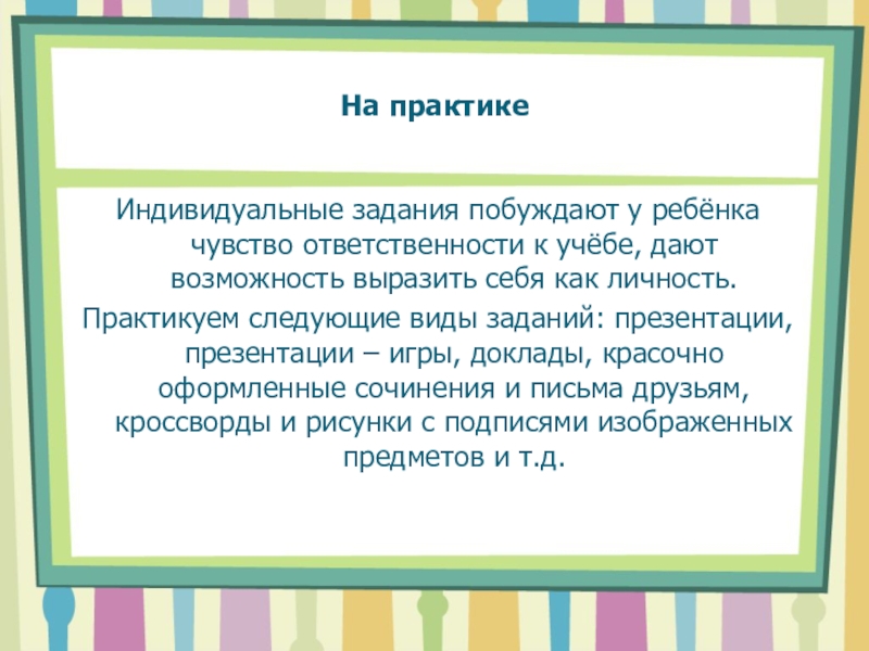 Индивидуальные задания побуждают у ребёнка чувство ответственности к учёбе, дают