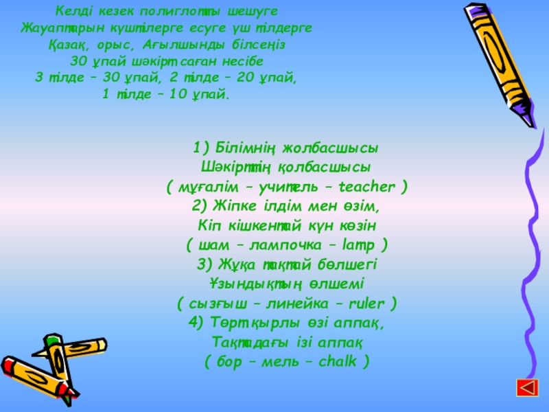 3 тілде – 30 ұпай, 2 тілде – 20 ұпай,