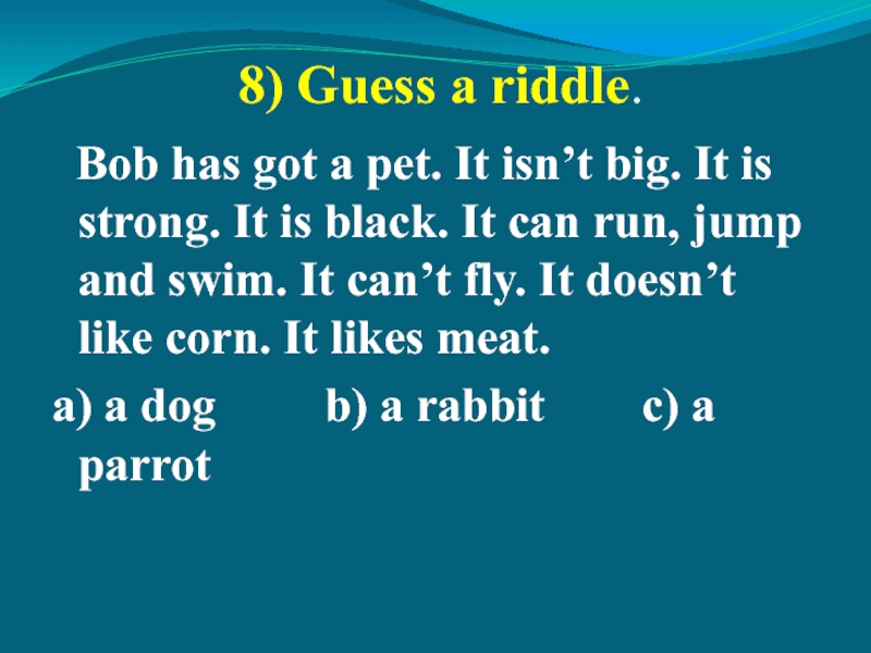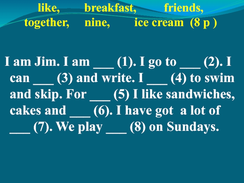 I am Jim. I am ___ (1). I go to ___ (2). I can ___ (3) and write. I ___ (4) to swim and skip. For ___ (5) I like sandwiches, cakes and ___ (6). I have got a lot of ___ (7). We play ___ (8) on Sundays.