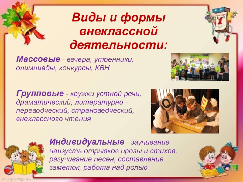 Виды и формы внеклассной деятельности: