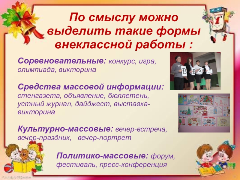 По смыслу можно выделить такие формы внеклассной работы :