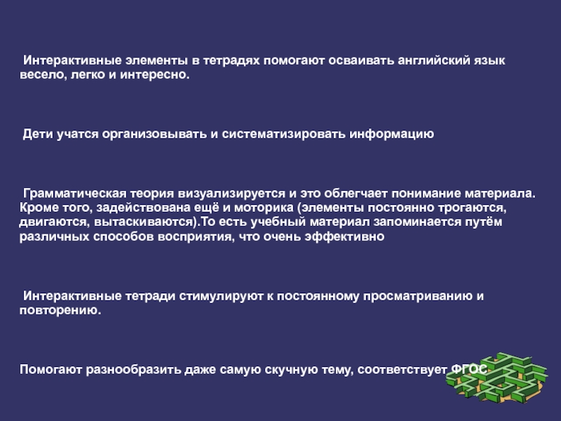 Грамматическая теория визуализируется и это облегчает понимание материала. Кроме того, задействована ещё и моторика (элементы постоянно трогаются, двигаются, вытаскиваются).То есть учебный материал запоминается путём различных способов восприятия, что очень эффективно