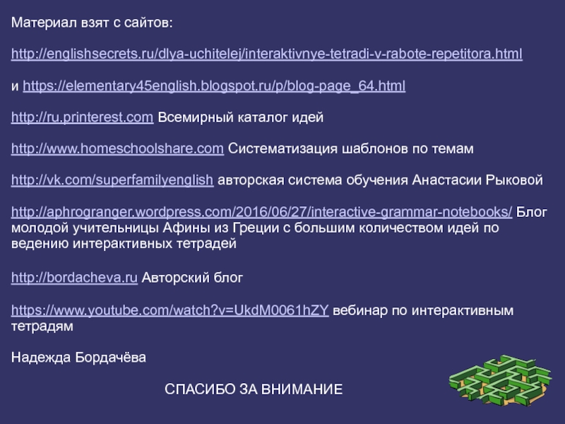 Материал взят с сайтов: http://englishsecrets.ru/dlya-uchitelej/interaktivnye-tetradi-v-rabote-repetitora.htmlи https://elementary45english.blogspot.ru/p/blog-page_64.htmlhttp://ru.printerest.com Всемирный каталог идейhttp://www.homeschoolshare.com Систематизация шаблонов по темамhttp://vk.com/superfamilyenglish авторская система обучения Анастасии