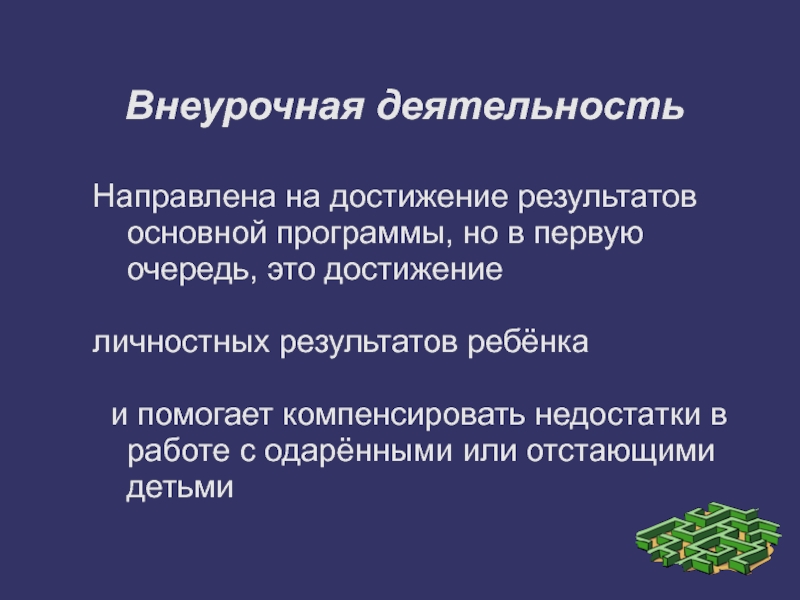 Внеурочная деятельностьНаправлена на достижение результатов основной программы, но в первую очередь, это достижение личностных результатов ребёнка и помогает компенсировать недостатки в работе с одарёнными или отстающими детьми