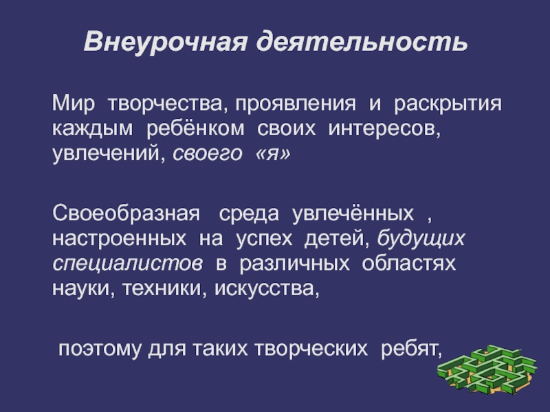 Внеурочная деятельностьМир творчества, проявления и раскрытия каждым ребёнком своих интересов, увлечений, своего «я»Своеобразная  среда увлечённых ,