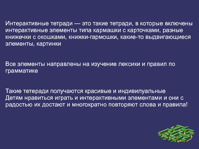 Интерактивные тетради — это такие тетради, в которые включены интерактивные элементы типа кармашки с карточками, разные книжечки