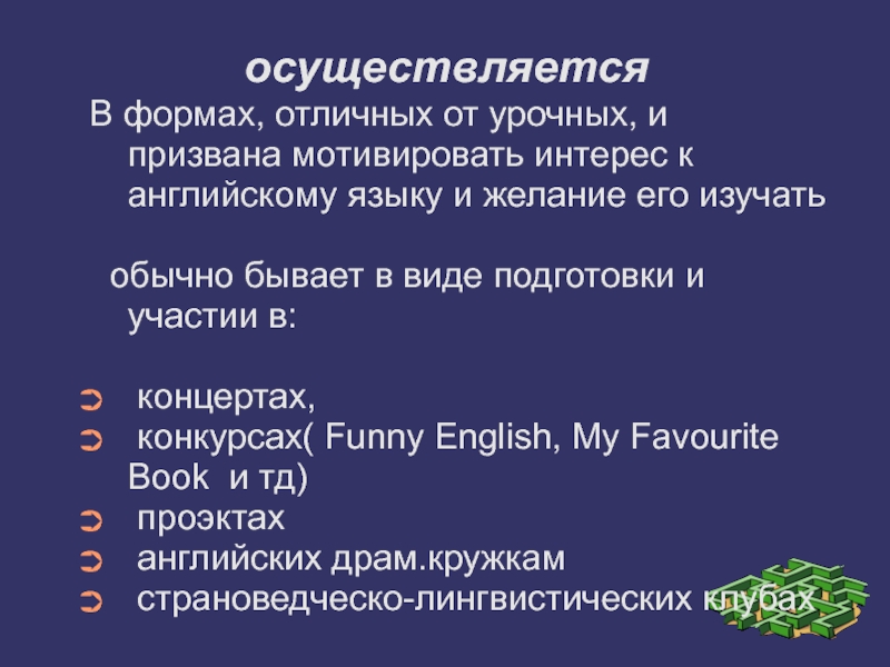 осуществляетсяВ формах, отличных от урочных, и призвана мотивировать интерес к английскому языку и желание его изучать обычно