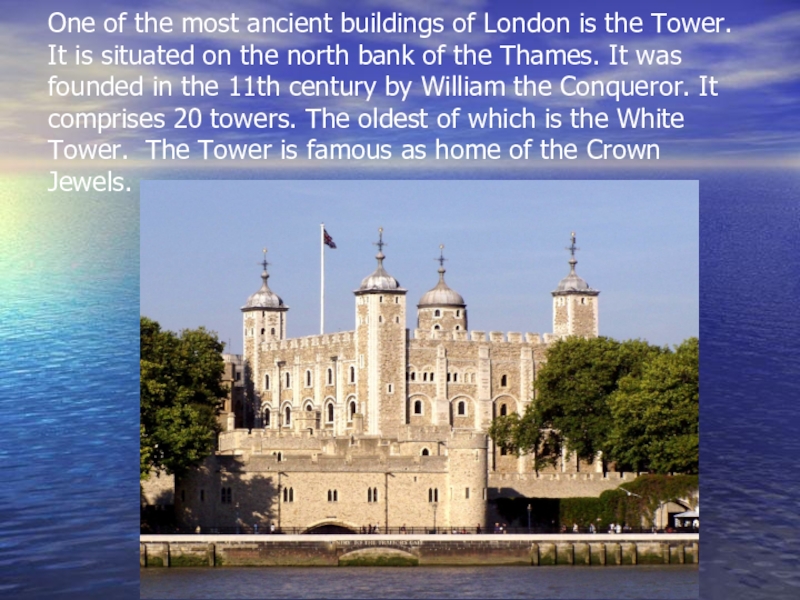 It is situated on the north bank of the Thames. It was founded in the 11th century by William the Conqueror. It comprises 20 towers. The oldest of which is the White Tower. The Tower is famous as home of the Crown Jewels.