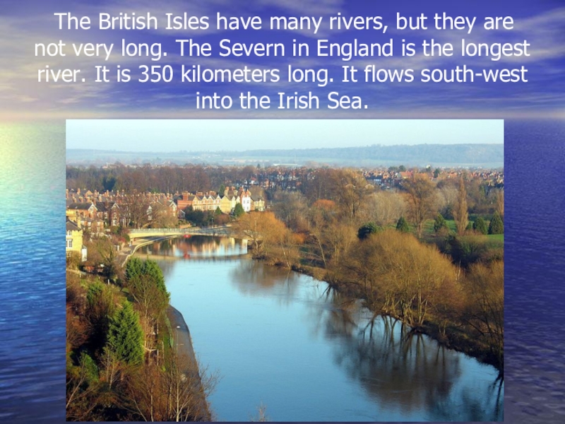 very long. The Severn in England is the longest river. It is 350 kilometers long. It flows south-west into the Irish Sea.