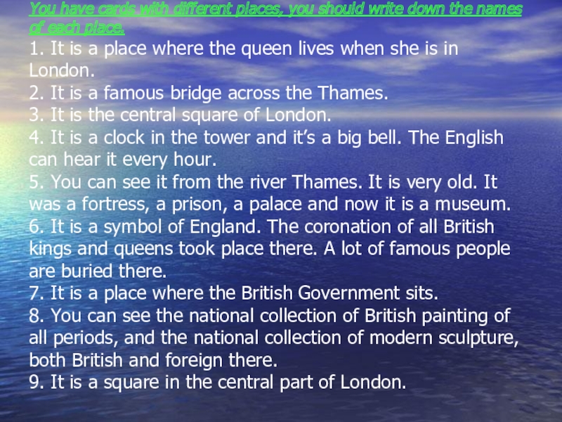 5. You can see it from the river Thames. It is very old. It was a fortress, a prison, a palace and now it is a museum.