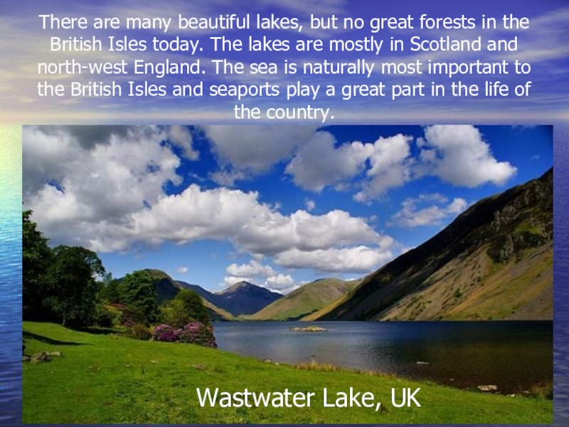 British Isles today. The lakes are mostly in Scotland and north-west England. The sea is naturally most important to the British Isles and seaports play a great part in the life of the country.