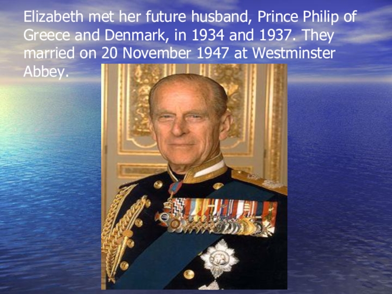 Слайд 27Elizabeth met her future husband, Prince Philip of Greece and Denmark,