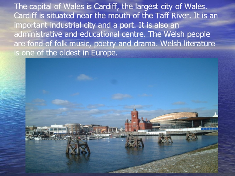Cardiff is situated near the mouth of the Taff River. It is an important industrial city and a port. It is also an administrative and educational centre. The Welsh people are fond of folk music, poetry and drama. Welsh literature is one of the oldest in Europe.