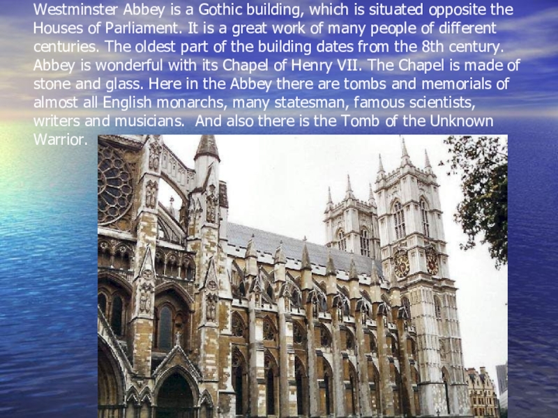 Слайд 9Westminster Abbey is a Gothic building, which is situated opposite the