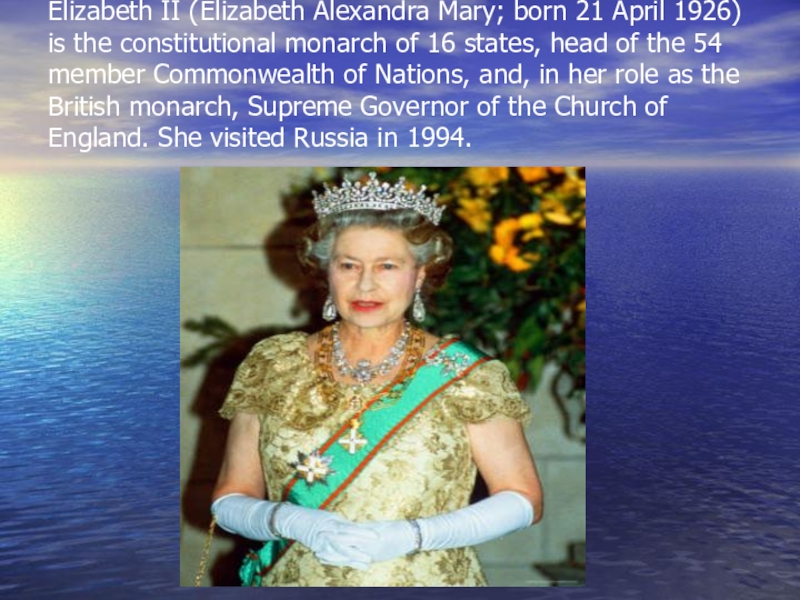 Слайд 26Elizabeth II (Elizabeth Alexandra Mary; born 21 April 1926) is the