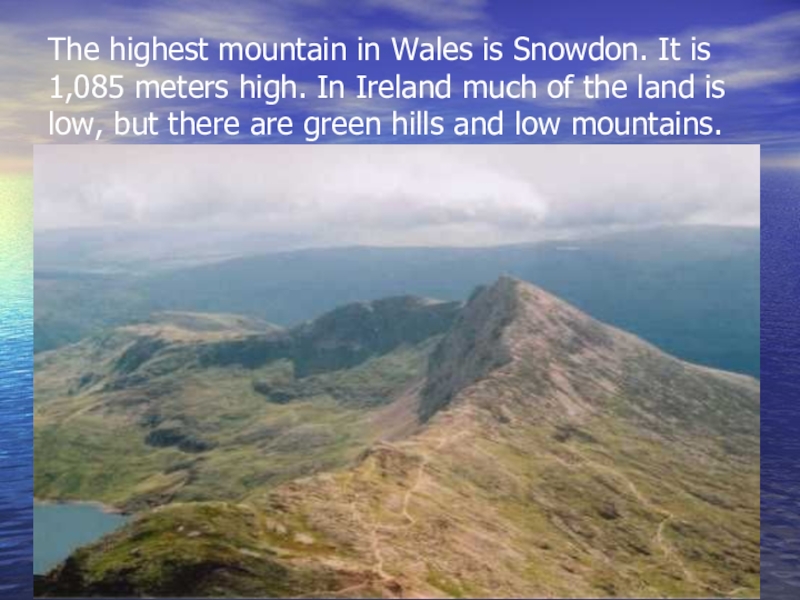 Слайд 13The highest mountain in Wales is Snowdon. It is 1,085 meters