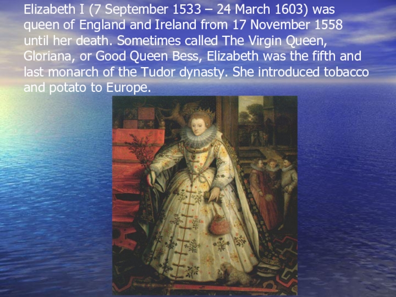 of England and Ireland from 17 November 1558 until her death. Sometimes called The Virgin Queen, Gloriana, or Good Queen Bess, Elizabeth was the fifth and last monarch of the Tudor dynasty. She introduced tobacco and potato to Europe.