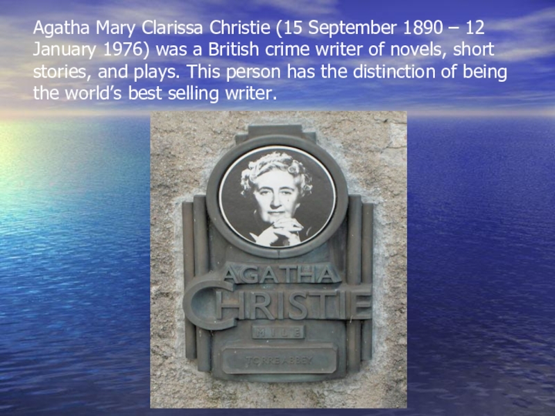 Слайд 22Agatha Mary Clarissa Christie (15 September 1890 – 12 January 1976)