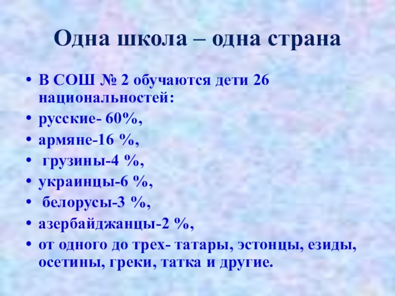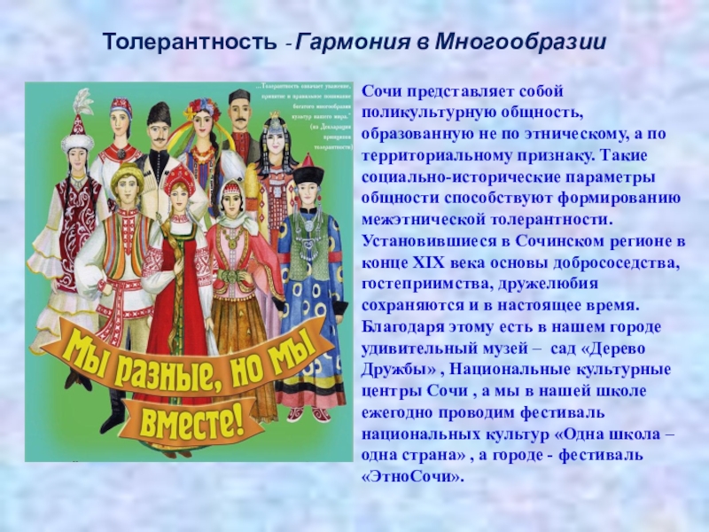 по этническому, а по территориальному признаку. Такие социально-исторические параметры общности способствуют формированию межэтнической толерантности. Установившиеся в Сочинском регионе в конце ХIХ века основы добрососедства, гостеприимства, дружелюбия сохраняются и в настоящее время. Благодаря этому есть в нашем городе удивительный музей – сад «Дерево Дружбы» , Национальные культурные центры Сочи , а мы в нашей школе ежегодно проводим фестиваль национальных культур «Одна школа – одна страна» , а городе - фестиваль «ЭтноСочи».