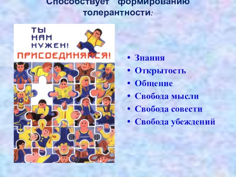 Слайд 6Способствует формированию толерантности: