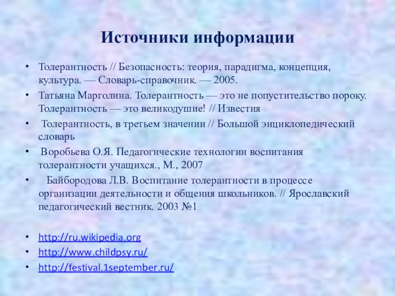 Воробьева О.Я. Педагогические технологии воспитания толерантности учащихся., М., 2007