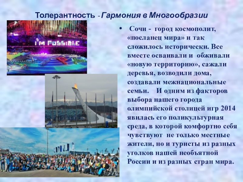 народов. Сочи это мирный, дружелюбный, интернациональный город и за всю его недолгую историю в нем не вспыхивали конфликты на межнациональной или религиозной основе. А для этого надо чтить традиции предков, быть терпимым к представителям других народов, уважать и любить этот город с удивительным названием СОЧИ