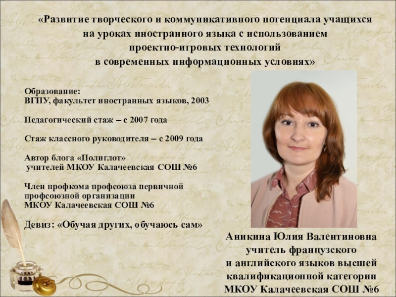 Девиз: «Обучая других, обучаюсь сам»