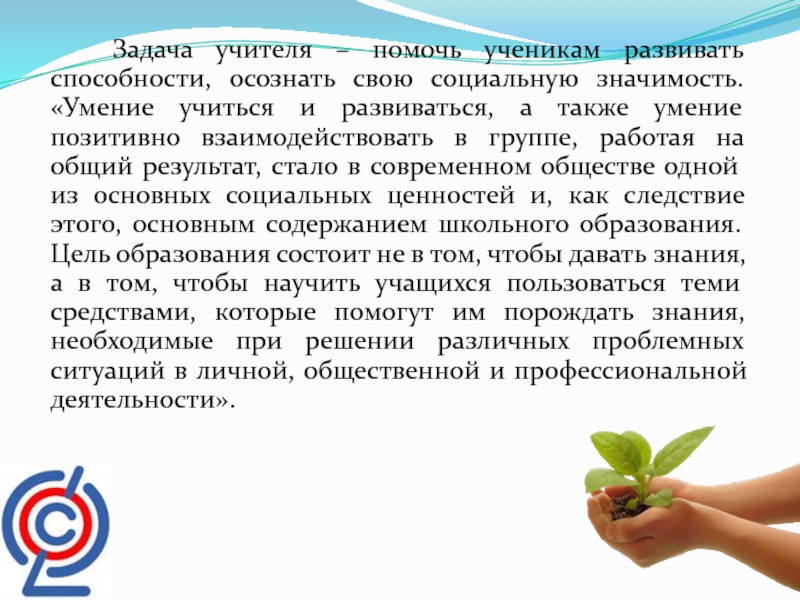 социальную значимость. «Умение учиться и развиваться, а также умение позитивно взаимодействовать в группе, работая на общий результат, стало в современном обществе одной из основных социальных ценностей и, как следствие этого, основным содержанием школьного образования. Цель образования состоит не в том, чтобы давать знания, а в том, чтобы научить учащихся пользоваться теми средствами, которые помогут им порождать знания, необходимые при решении различных проблемных ситуаций в личной, общественной и профессиональной деятельности».