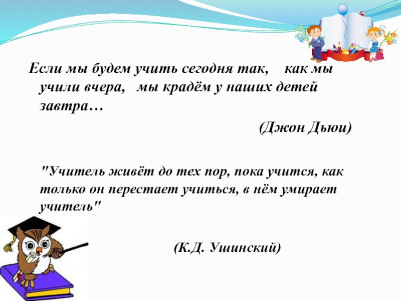 "Учитель живёт до тех пор, пока учится, как только он перестает учиться, в нём умирает учитель"