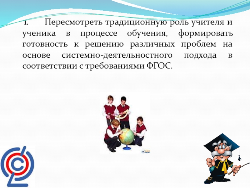 Слайд 13 1. Пересмотреть традиционную роль учителя и ученика
