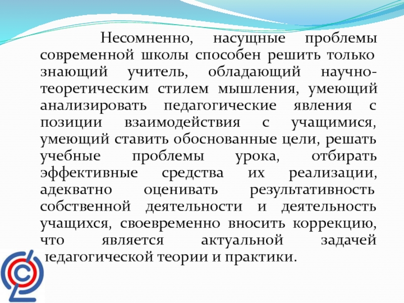 учитель, обладающий научно-теоретическим стилем мышления, умеющий анализировать педагогические явления с позиции взаимодействия с учащимися, умеющий ставить обоснованные цели, решать учебные проблемы урока, отбирать эффективные средства их реализации, адекватно оценивать результативность собственной деятельности и деятельность учащихся, своевременно вносить коррекцию, что является актуальной задачей педагогической теории и практики.