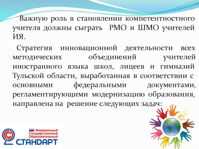 Стратегия инновационной деятельности всех методических объединений учителей иностранного языка школ, лицеев и гимназий Тульской области, выработанная в соответствии с основными федеральными документами, регламентирующими модернизацию образования, направлена на решение следующих задач: