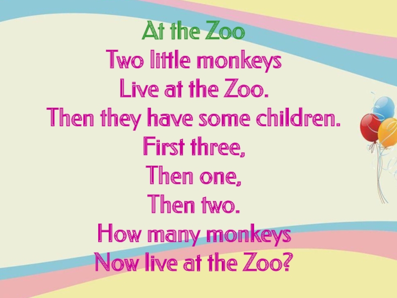 At the Zoo Two little monkeys Live at the Zoo. Then they have some children. First three,