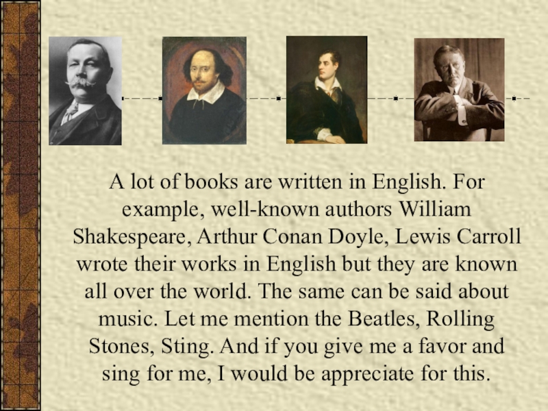 authors William Shakespeare, Arthur Conan Doyle, Lewis Carroll wrote their works in English but they are known all over the world. The same can be said about music. Let me mention the Beatles, Rolling Stones, Sting. And if you give me a favor and sing for me, I would be appreciate for this.