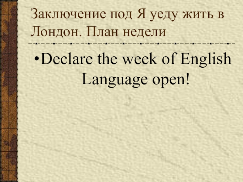 Слайд 30Заключение под Я уеду жить в Лондон. План недели